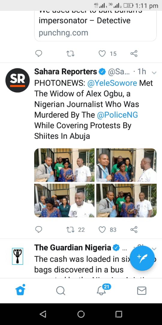 This was revealed in a tweet by the official Sahara Reporters tweeter handle with the tweet PHOTONEWS @YeleSowore Met the Widow of Alex Ogbu, a Nigerian Journalist Who was Murdered by The @PoliceNG While Covering Protests By The Shiites in Abuja.